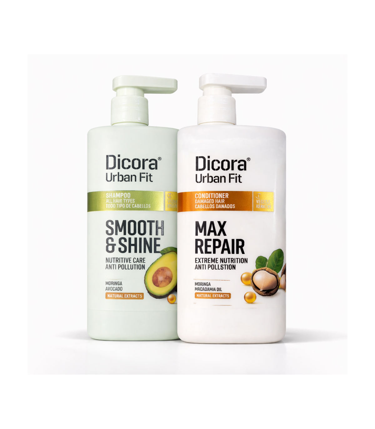 Dicora Urban Fit Kit Shampoo e Balsamo Nutriente unisce Smooth & Shine Shampoo e Max Repair Conditioner in un trattamento completo per la cura quotidiana dei capelli. Lo shampoo con avocado, moringa e cheratina vegetale deterge delicatamente e aiuta a lasciare i capelli morbidi, leggeri e luminosi. Il balsamo con olio di macadamia, moringa e cheratina vegetale contribuisce a nutrire la fibra capillare, migliorando morbidezza e pettinabilità. Entrambi senza siliconi e con estratti naturali, sono ideali per chi desidera capelli più setosi, disciplinati e dall’aspetto sano. Kit composto da 2 flaconi da 800 ml.